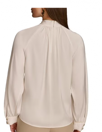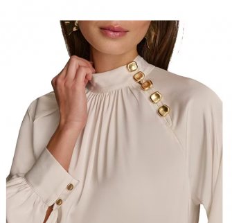Donna Karan Stretch Satin Gold-Button Mock Neck Long Sleeve