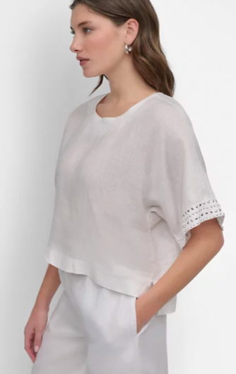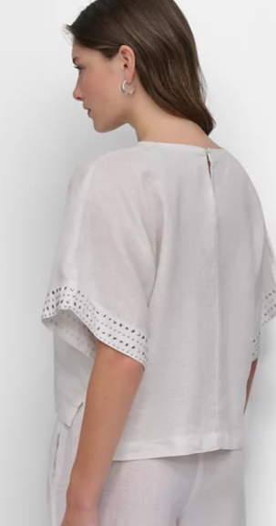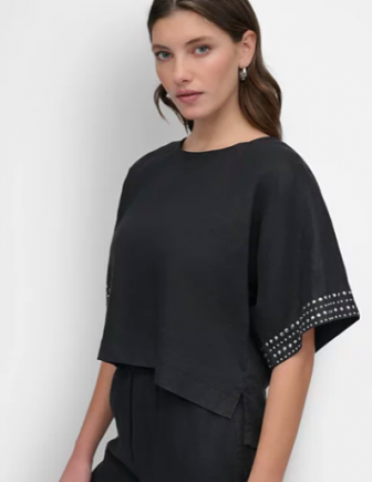 DKNY Women's Cropped Short-Sleeve Studded Linen Top