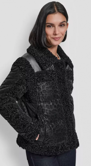DKNY Women's Collared Mixed Media Cheetah Tech Jacket