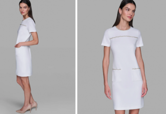 KARL LAGERFELD PARIS SCUBA CREPE SHIFT DRESS WITH CHAIN TRIM