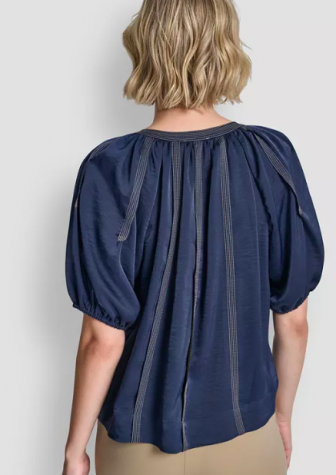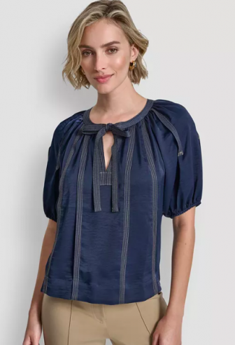 DKNY Women's Puff-Sleeve Top Stitch Tie-Front Top